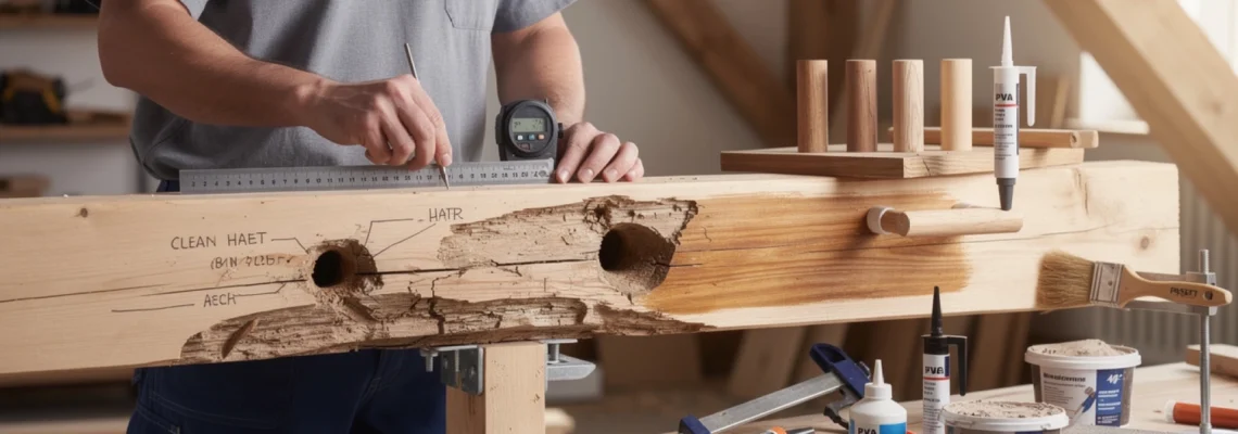 Pour reboucher un trou de perçage dans une poutre porteuse, la technique traditionnelle de chevillage reste une valeur sûre. Elle consiste à insérer dans le trou une cheville ou un tourillon en bois dur (chêne, hêtre, frêne), collé à la colle vinylique (PVA) ou à la colle polyuréthane. Ces essences présentent une excellente résistance mécanique et un module d’élasticité compatible avec celui des résineux utilisés en charpente, ce qui permet une bonne transmission des efforts dans la zone réparée.